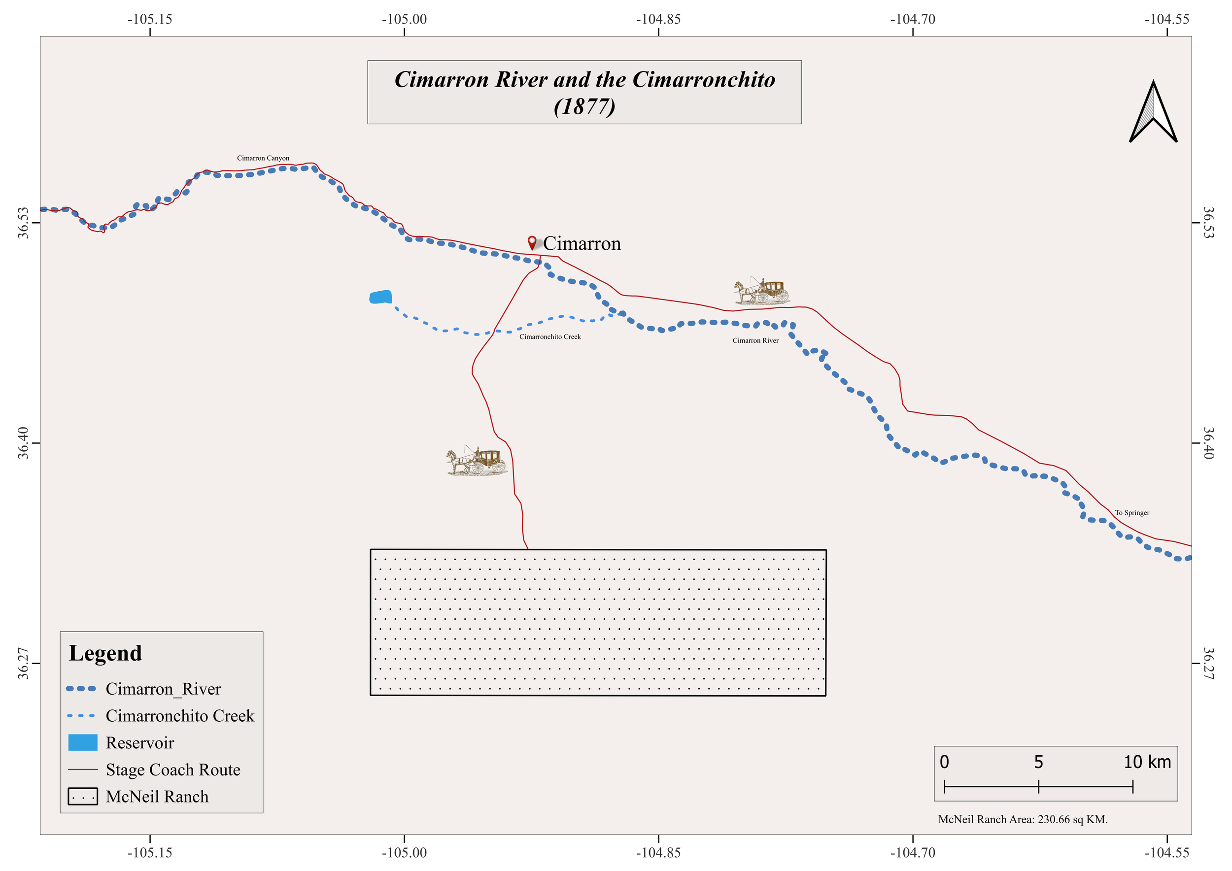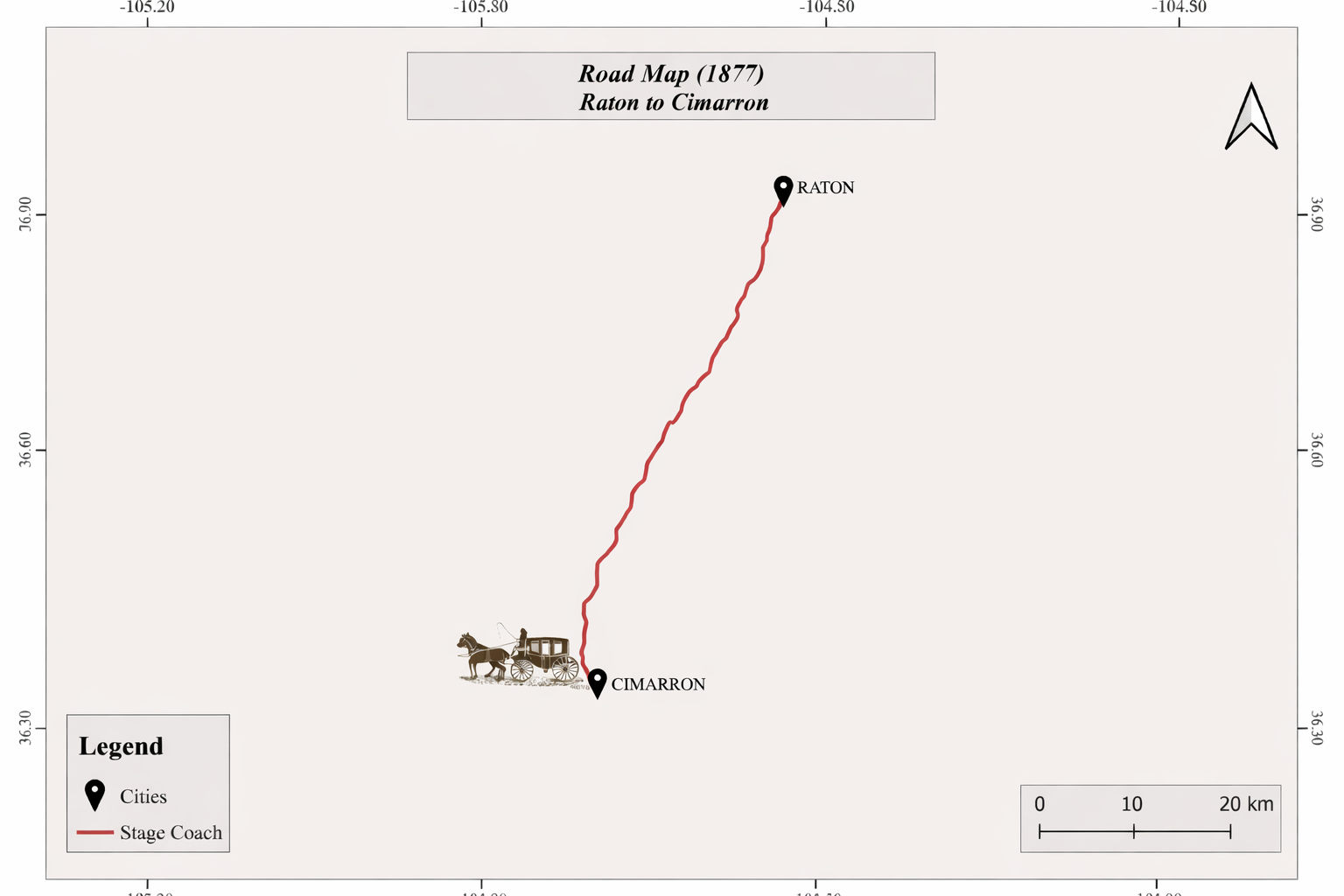 Map 7. Road Map (1877): The McNeils’ Isolated Wagon Journey from Raton to Cimarron (Chapter X)